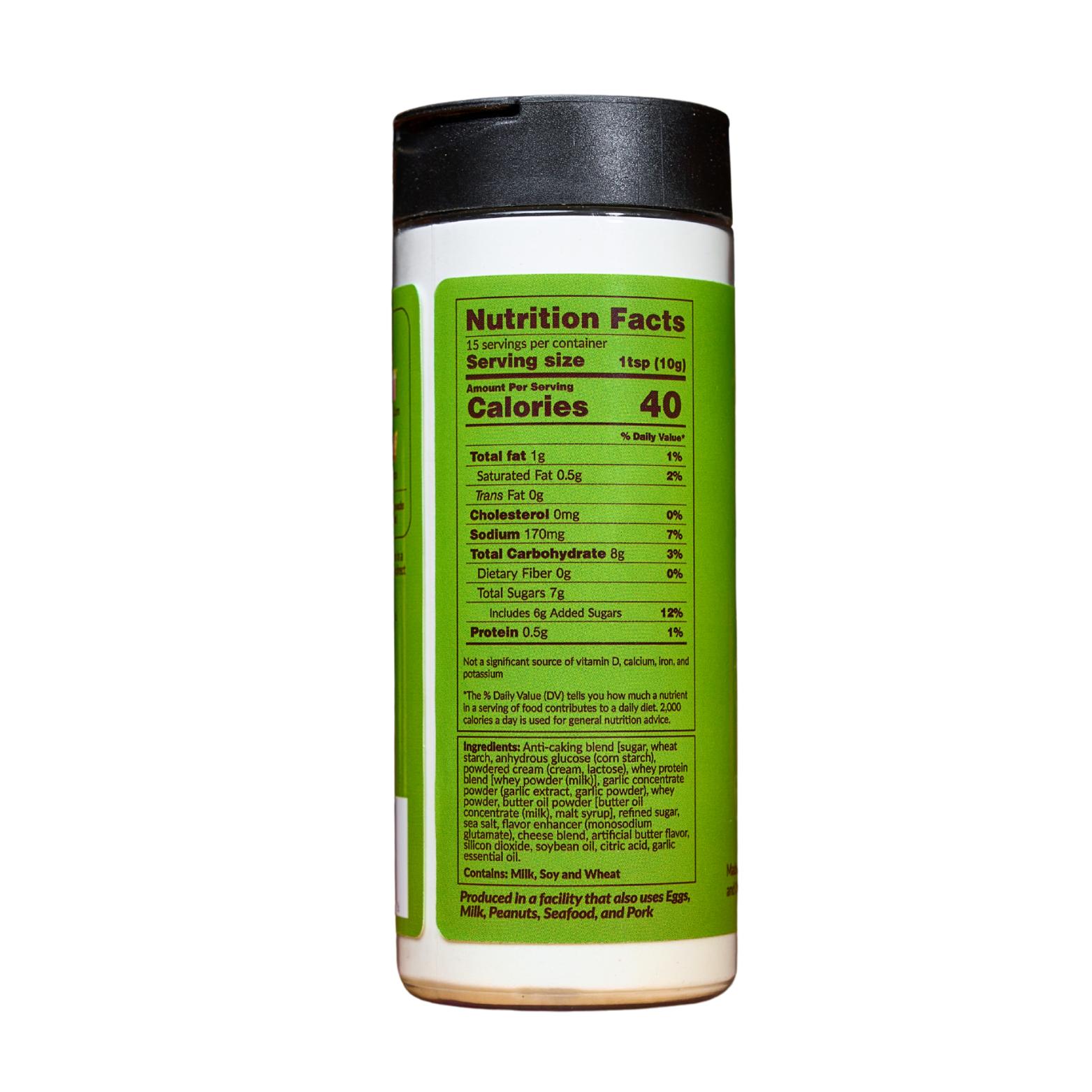 Ingredients: Anti-caking blend [sugar, wheat starch, anhydrous glucose (corn starch), powdered cream (cream, lactose), whey protein blend [whey powder(milk)], garlic concentrate powder (garlic extract, garlic powder), whey powder, butter oil powder [butter oil concentrate (milk), malt syrup, refined sugar, sea salt, flavor enhancer (monosodium glutamate), cheese blend,