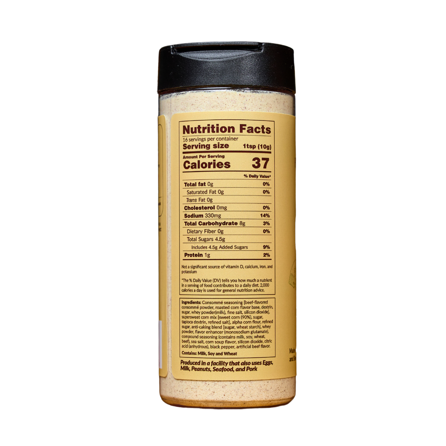 Ingredients: Consommé seasoning [beef-flavored consommé powder, roasted corn flavor base, dextrin, sugar, whey powder (milk), fine salt, silicon dioxide], supersweet corn mix [sweet corn (90%), sugar, tapioca dextrin, refined salt, alpha corn flour, refined sugar, anti-caking blend [sugar, wheat starch], whey powder, flavor enhancer (monosodium glutamate), compound seasoning (contains milk, soy, wheat, beef), sea salt, corn soup flavor, silicon dioxide, citric acid (anhydrous), black pepper, artificial beef flavor.